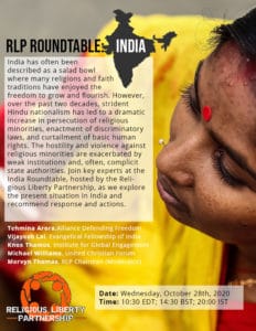 Join key experts at the India Roundtable, hosted by the Religious Liberty Partnership, as we explore the present situation in India and recommend response and actions. RLP members can register here: https://tinyurl.com/y4t2ttoj. If you are not a member of the RLP, please contact Brian @RLPartnership.org for an invitation. Moderated by RLP Chairman, Mervyn Thomas, resource speakers…